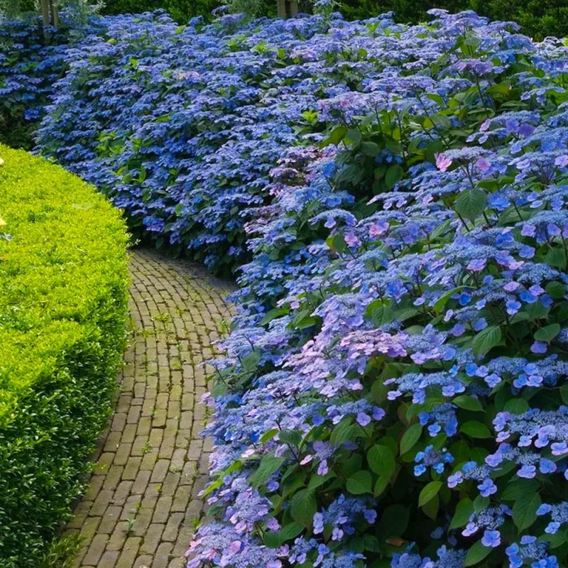Hortensja piłkowana Veerle ® to piękna odmiana kolekcjonerska. Niewysoki i zwarty pokrój (od 80-120 cm wysokości) oraz kwiaty pojawiające się na niej od czerwca do października sprawiają, że jest jedną z piękniejszych odmian. Delikatne i niemal koronkowe kwiatostany zebrane są w płaskie baldachogrona o szerokości do 15 cm. W zależności od kwaśności gleby kwiaty mogą być różowe lub niebieskie. Liście tej odmiany również zachwycają formą i barwami. Są ciemnozielone i ostro ząbkowane, a na jesieni wybarwiają się na intensywny, ciemnoczerwony kolor. Jej kwiaty nadają się również do cięcia i do suszenia.