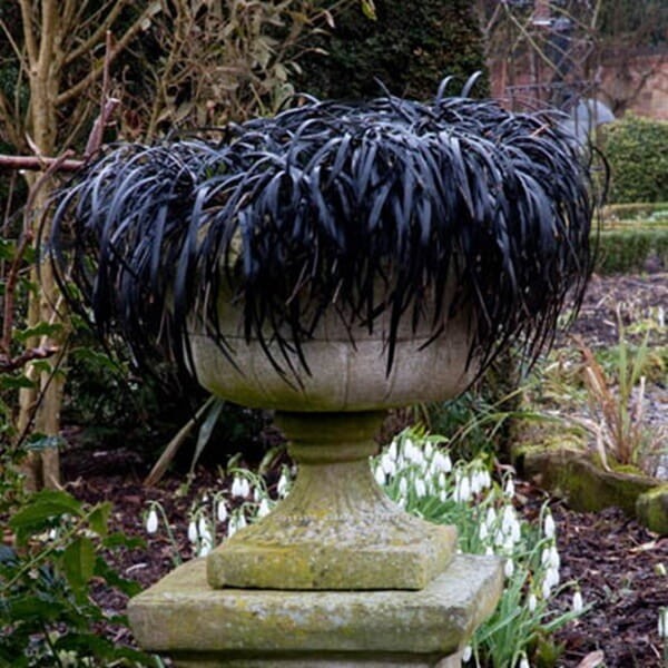 Czarna trawa należy do rodziny konwaliowatych, gatunek w warunkach normalnych występuje w Japonii. Jest byliną zimozieloną, ale często nazywana jest potocznie trawą, jednak nie należy do traw. Roślina tworzy zwarte kępy o wysokości 10-20 cm, posiada wąskie, lekko łukowato wygięte liście, nieco podobne do traw. Odmiana "Nigrescens" znana jest też pod nazwą "Black Dragon" lub "Ebony Knight" i ma prawie czarne liście, szczególnie dekoracyjne. Od lipca do września pojawiają się piękne kwiaty - małe, białe z lekko różowym zabarwieniem, przypominające kwiaty konwalii. Po kwiatach na roślinie pojawiają się dekoracyjne owoce przypominające grafitowe perły.